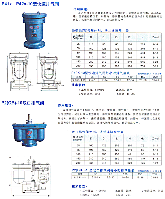 c65bP41X、P42X、P2(QB)快速排氣閥/雙口排氣閥誕生于70年代,體形大,重量重,排氣量小,該排氣閥在80年代末為理想產品,問世以來一直還續用。排氣閥是管道必配設備,安裝在管道高點或閉氣地方,來排除管內氣體,來疏通管道,使管道運轉正常,保證排氣時絕不排水.只要系統有壓力,排氣閥就會連續不斷的排氣