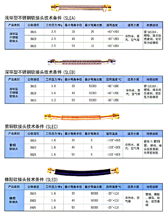 我公司生產的波紋補償器是依據《GB/T12777-1999》國家標準并 參考美國膨脹節商業協會《EJMA》等各行業標準設計制造。 金屬軟管具有良好的可燒性及耐溫、耐壓、耐腐性能,適用于蒸汽、 水、油類及各種工業氣體、藥品等介質輸送。對管系的運動,熱膨脹 吸收、振動吸收起著重要作用