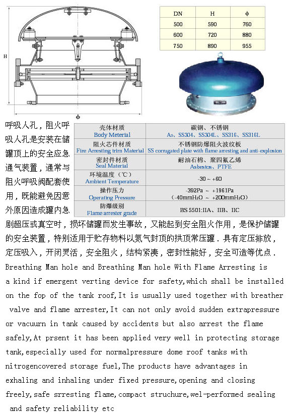 呼吸人孔(KHXF-HR) 呼吸人孔(KHXF-HR),阻火呼吸人孔是安裝在儲(chǔ)罐頂上的安全應(yīng)急勇氣裝置,通常與阻火呼吸閥配套使用,既能避免因意外原因造成罐內(nèi)急劇超壓或真空時(shí),損壞儲(chǔ)罐面發(fā)生事故,又能起到安全阻火作用,是保護(hù)儲(chǔ)罐的安全裝置,特別適用于貯存物料以氮?dú)夥忭數(shù)墓绊敵汗蕖>哂卸▔号欧牛▔何耄_閉靈活,安全阻火,結(jié)構(gòu)緊湊,密封性好,安全可造等優(yōu)點(diǎn)。 |