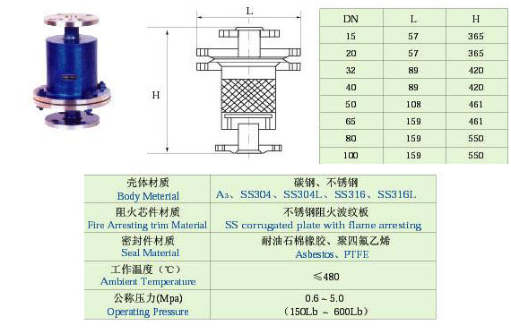 詳細說明: ① 阻火器適用于儲存閃點低于28℃的甲類油品和閃點低于28℃的乙類油品,也適用于儲存物料以氮氣封頂?shù)墓绊敼奚希[石阻火器與網型阻火器原理同上,用在管道上。 ②與呼吸閥、呼吸人孔配套使用,也可單獨使用。